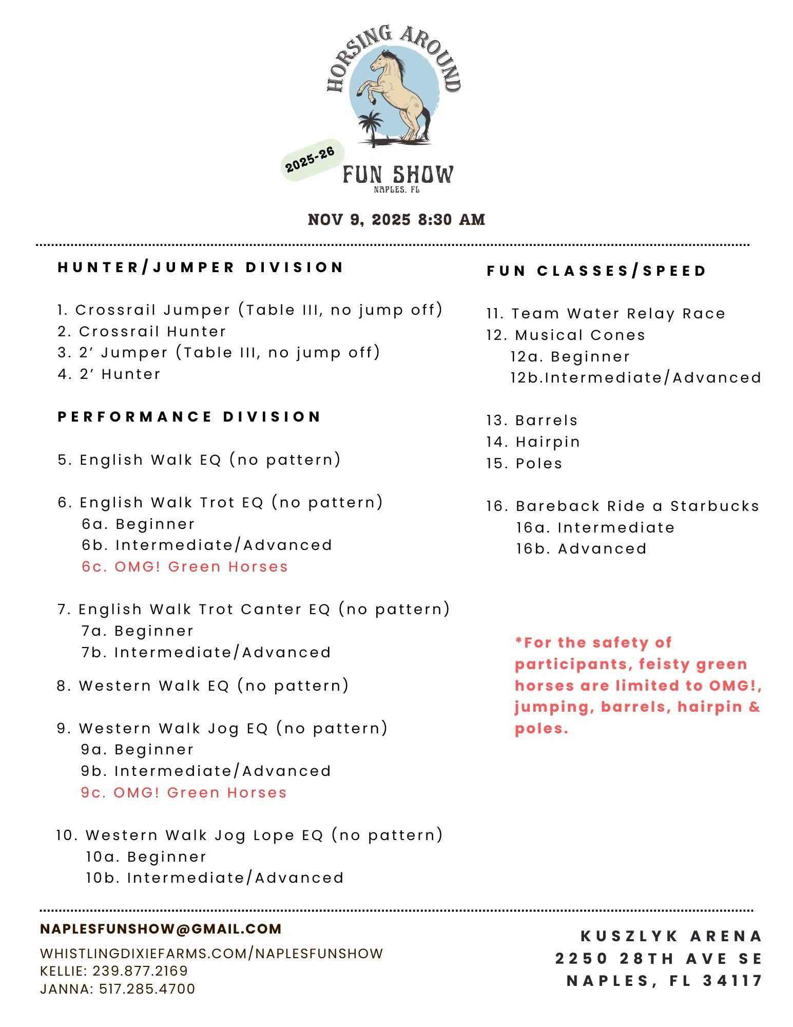 Welcome to the Horsing Around Fun Horse Show in beautiful Naples, Florida! Our show offers an affordable opportunity for local riders of all ages and skill levels to come together, connect, learn, and grow in a supportive and fun environment.
