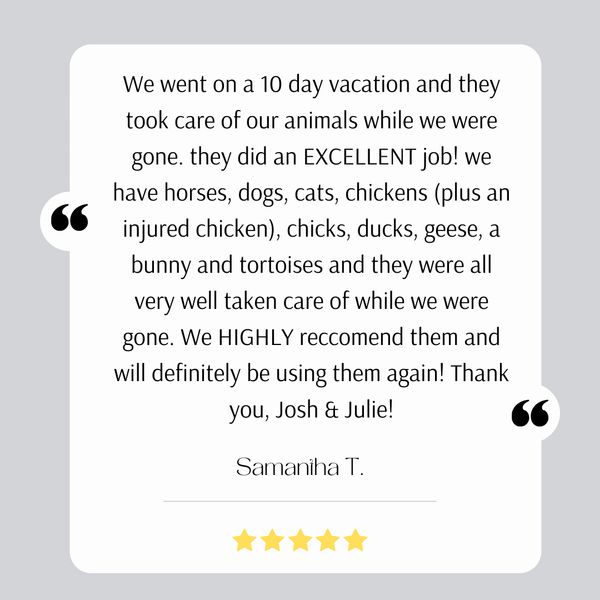 Living on our own farm, we know how hard it is to be away from your animals. Through years of experience caring for just about every animal, you can trust that with our farm visits, they'll all be well taken care of.